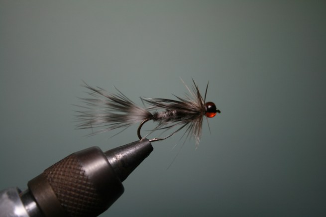 The above fly is nothing exceptional: a size 8 hook, two chickabou feathers. Tie in one to create the tail then spin the secured feather by the butt and then form a fuzzy rope and wrap. I could have incorporated a rib but in this instance I didn’t. Then tie in another feather and wrap a hackle collar. Henry would make it smaller. I am still learning how to use the various sized feathers on a chickabou cape. The bead is a glass bead. Henry said sometimes experiment and forget the typical metal beads of gold, silver, black, brass and try an odd colored bead. Also, it will aid the fly in riding more horizontal in the retrieve rather than the up then dive down retrieve. It is worth an experiment.