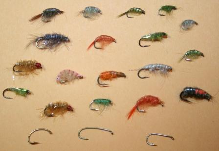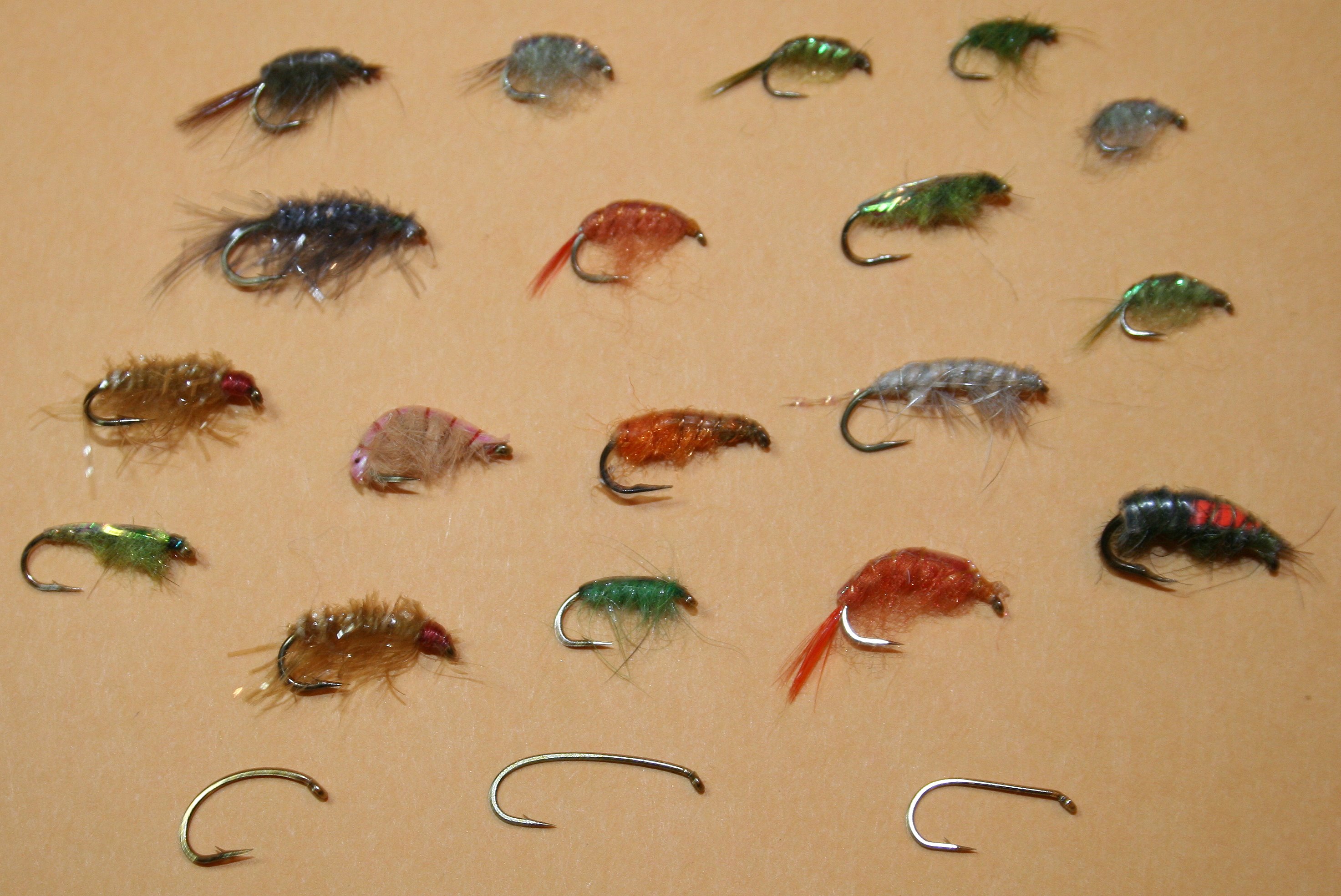 The photo displays past ties for scuds. Some have been successful and some seemed to have no influence at all. I am wondering if the shank style could influence the presentation of the scud. I like Ian James’ scud with the bead positioned at the center of the shank. I am going to tie my next batch of scuds on the center hook with the modified bend in the hook. This may provide a balance between the scud’s resting, feeding and swimming positions (curved and extended). The flies are my efforts over the years sans the pink commercial tie. I can only think the curved/pupa shank that we all find appealing is better suited for a drifting (stream) or static (lake) presentation. Otherwise it seems to lay over or tumble. I am still definitely incorporating the Ian James center bead style.
