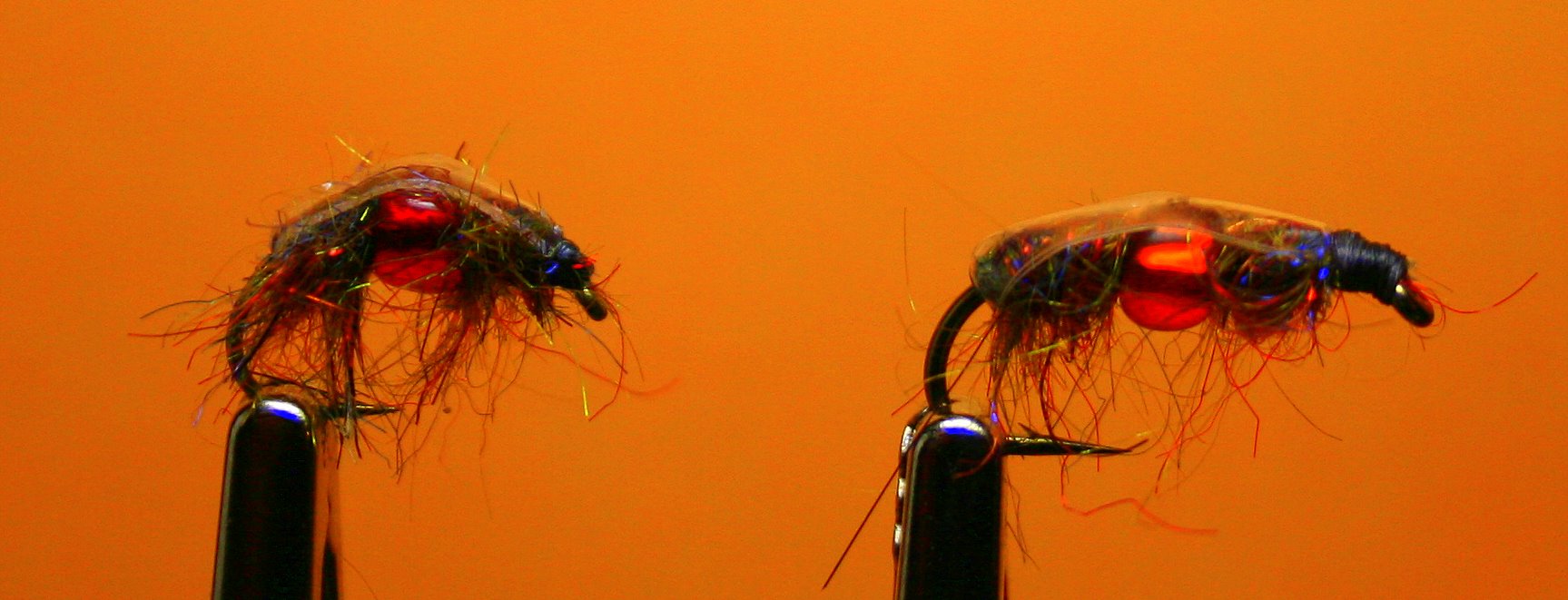 I have opted for the straighter shanked hook (or very slight bend) for lake scuds. I have not yet attempted to perfect how to rib the shellback with the bead in the middle. With the straighter shank the shellback appears to be more durable and likely to stay in place, rather than skewing to the side as it seems to do on a curved pupa/scud hook. Still an experiment for me….no sweat. I will get back to it some day. I tied a dozen of these and never got around to smaller sizes. I will see how they work. The dubbing mix was a leech pattern mixture I bought from some Kamloops’ tyers at a flytying expo. It was sold as a good leech dubbing…the photo shows the mixture of colored filaments quite well.