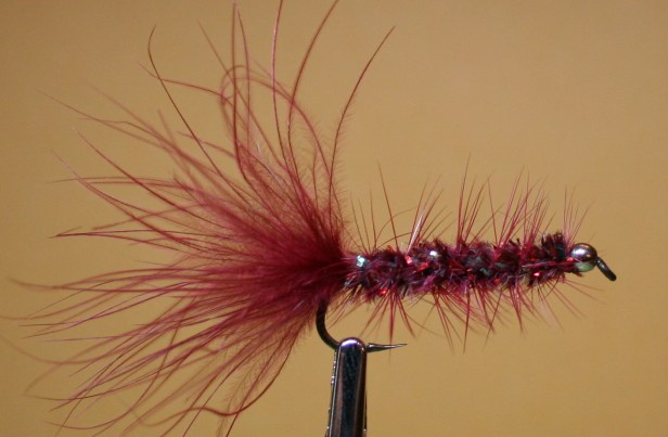 The often forgotten option for Woolly Buggers is the maroon bodied leech pattern. Quite popular in B.C. lakes, it is less used to the South. I always tie and carry these flies, but not that many (maybe a couple dozen). When I look at this fly, in the selection process, I usually pass by it and pick something else. This week I heard that this fly was hugely popular with all available species of fish on a certain Central Oregon lake. So, now my curiosity is now peaked and I will have to give this pattern more attention. Actually, I will start with this as a point fly this coming weekend….followed by a Callibaetis nymph let’s say.