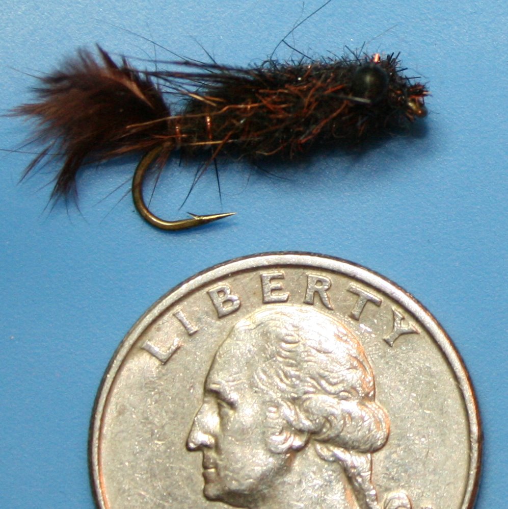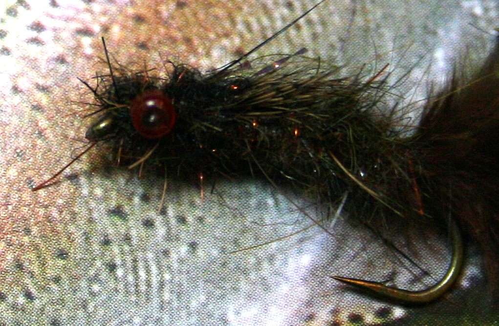 This fly was created about 3-4 years ago to provide a smaller partner to the Kaufmann Dragon. It was tied smaller, but buggier and spikier (ok, not real adjectives, but bare with me). A mixtrue of brown and olive Hare’s Ear dubbing. The tail was a short bunch of marabou (Chickabou could be used). The hook was a stout #10 (3xl). Red, black and green eyes have been used to good affect. Green, copper and gold ribbing were used. The abdomen is touch dubbed for spikes from the guard hairs. A grouse or partridge feather is wound once for minimal legs, then the thorax/head area is dubbed again around the eyes (tied on top of the shank) to the eye of the hook. The Scarecrow affect is wanted here: guard hairs/straw sticking out from tail to the eye of the hook. There was no weight added to the fly. Intermediate or Type 2 lines taking the unweighted fly downward were used.These were tied up and fished for one season and then some how put in a small fly box, then in a drawer beneath a workbench in the garage. An archeological dig recently uncovered them. I am so darn excited to include these into my Dragon and Damsel arsenal. The Scarecrow…..tie ’em and use.