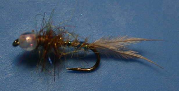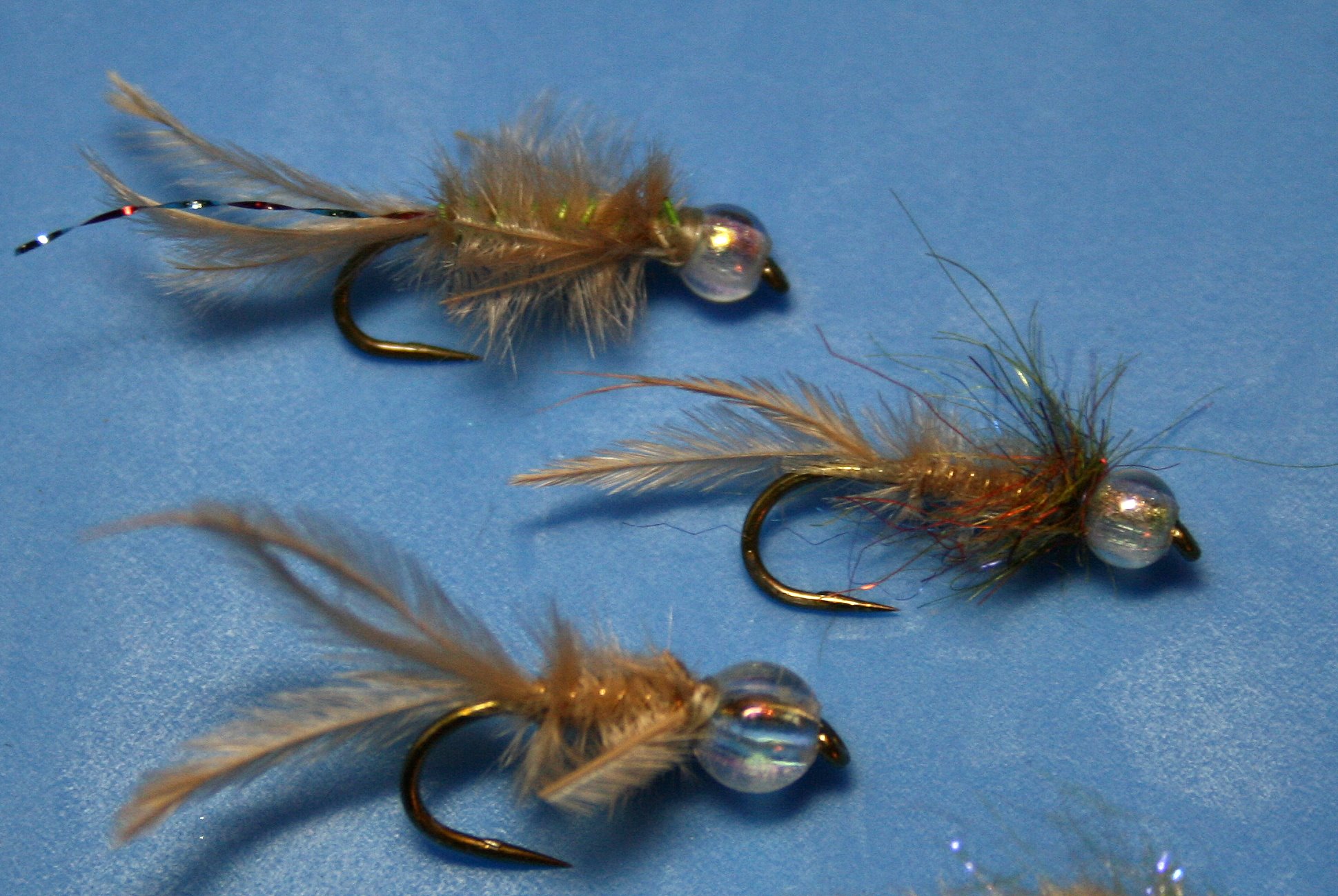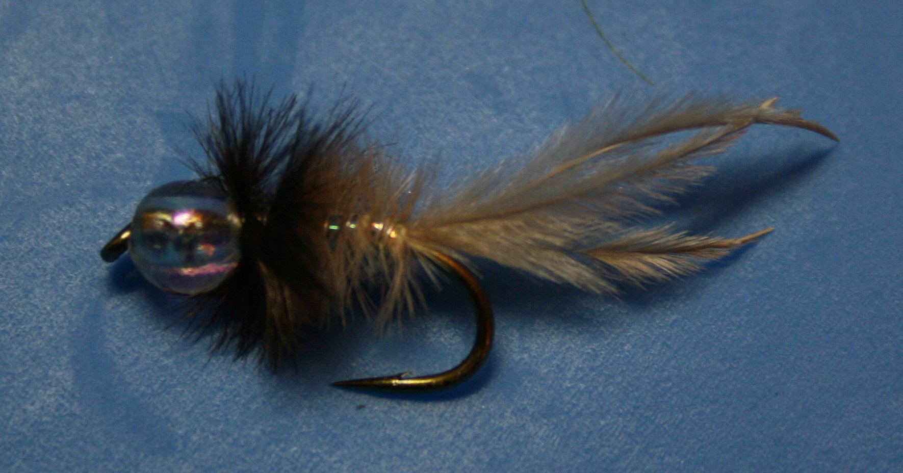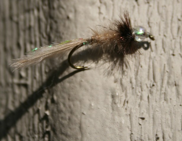 For you guys that still call that stick a pole, not a rod, unrequited love is like what the hell is up with the rejection? Where’s the love? Nary a query. Well in a desperate, attention seeking attempt at self worth, The Orb flaunts her stuff again in a variety of costumes. Still maintaining the ostrich fibers tail and ostrich wrapped body only the thorax changes a little and of course the Orb. Read the earlier postings re gas bubbles, emergers and buoyancy and The Orb will shine. It caught a few fish as a low sleuthing nymph and it will roundly shine when Callibaetis are dancing about beneath the surface, in the surface and departing the surface. As I have previously written, I borrowed Stalcups ostrich tails, and ‘gilled’ abdomen. I have used ostrich here too because the task of wrapping a goose biot still daunts me on smaller flies. I have mixed the ribbing from gold, to copper to green and the thorax has been either darker ostrich, darker, shiny dubbing or dark rabbit. Make the tails as long as the shank. I know by photo’s the head on a Callibaetis nymph is as narrow or narrower than the thorax but here I have fudged in an attempt to make the Orb bead be the primary focus along with the willowy, lifelike tails. So, consider the possibility next time you have a Callibaetis hatch and your reach for the same old Quigley, Klinkhammer, Adams, Bird’s Nest, etc….”I could have used The Orb!!! What the hell’s wrong with me?” It is a simple fly to tie and it, in its’ preliminary use did pretty good in less than productive circumstances. I think it will be an excellent fly in the upper strata of the emergence and probably lower too. I have posted quite a few items or pics re this pattern if you clear the search box and query Orb, Callibaetis, etc.