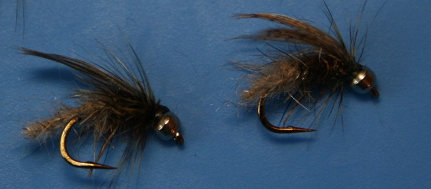 Tied on a pupa hook, size 12, silver tungsten bead head, black thread, dubbing brush laying around from Czech Nymph use, so tied it in and extended a portion rearward, then wrapped forward and created darker thorax. Tied in Hen/Rooster (Harriet/Harry) hackle fibers over the top of thorax and abdomen (like an old leadwing & peacock wet) then wound a turn or two of dark hackle and whip finished the head. Basic pupa, but I am reversing my thoughts here to top downward and not just initially bottom up as in a hatch. Click on photo’s to enlarge for great views. Why the Harriet/Harry? Well, as chicks grow up, things aren’t always as they first appear. “Cock-a-doodle-doo”