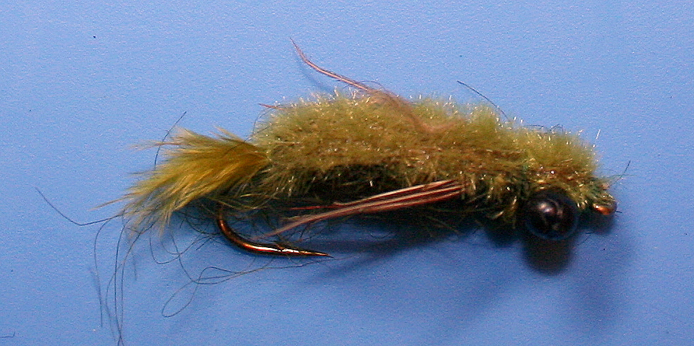 Tony Muncy had an equally successful day and the above homely, little Fuzzy Dragon, in green, bug eyed and all, was a killer fly. Dragon flies came off for hours (not much else until an evening midge hatch) and the Fuzzy Dragon(s) were eventually torn to shreds. The fly accounted for dozens and dozens of trout. Also, productive patterns were The Orb, Prince Nymph, Calico Woolly Bugger, Lightning Bug, Lake Bait  and a lighter green leech pattern. The picture below is of a Lake Bait fly. This pattern was new to us and provided to Tony by a generous lady he met on the lake. He tried it and it was also a productive fly. Tied on a size 10 hook, it was a pretty big fly. You can see it is basically a fat Carey Special with hot red overwing and the Marabou/Chickabou tail. It worked well and that overwing really glowed.