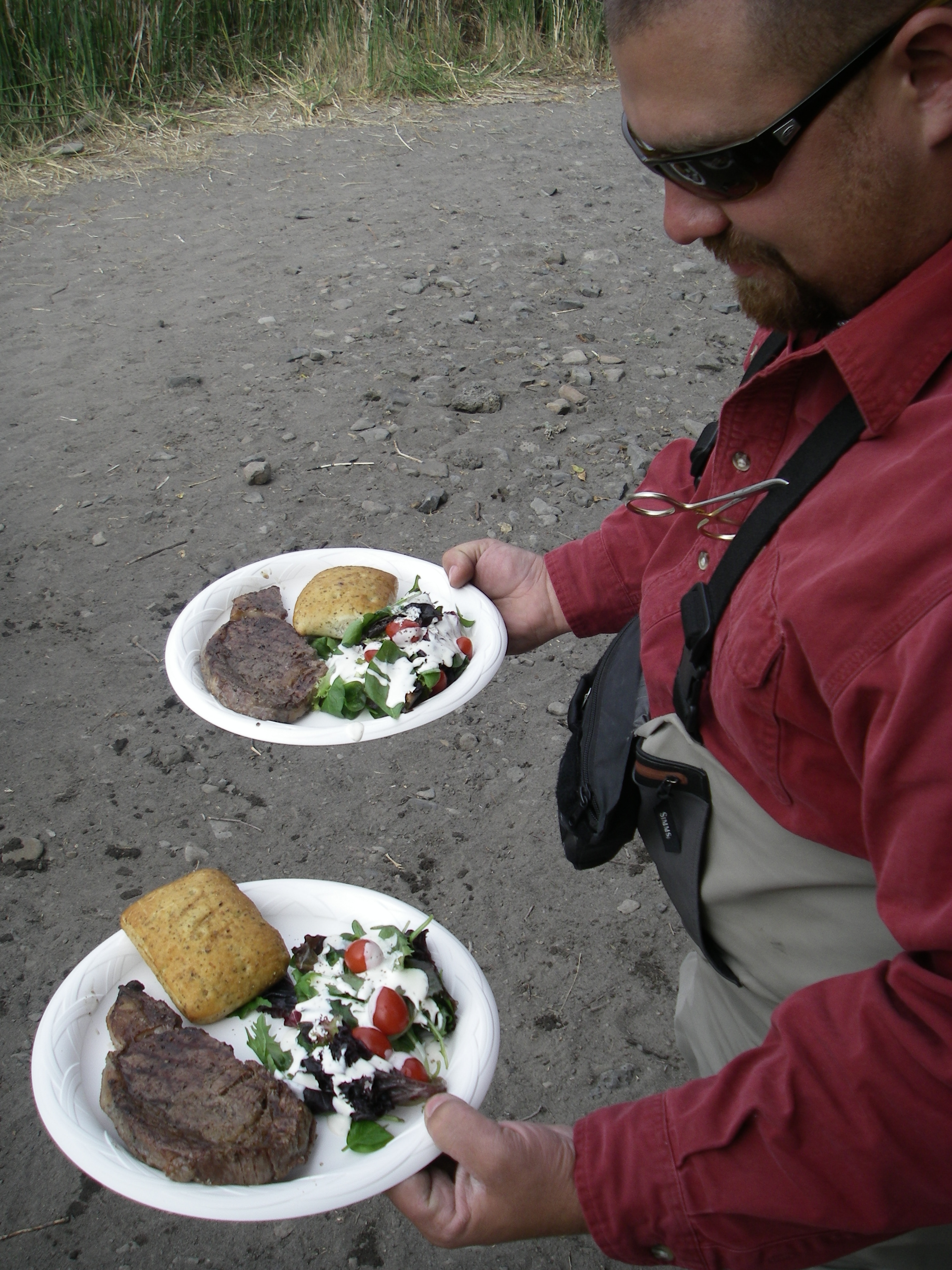 We broke for lunch and it was a great meal. Of course, food always taste better outdoors, but this really tasted good. Nice ribeye steaks, salad and dressing, nice rolls and cookies washed down with ice cold (did I say it was freezing out) beverages. Matt did a nice job setting up the camp and cooking in short order.