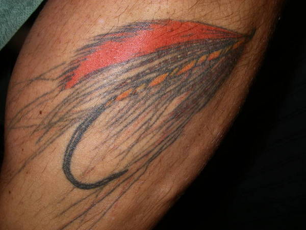 Hey that’s my leg! tattoo by Dave Allen…who also did a awesome Al Hassell drawn Steelhead eating a dry on my shoulder…