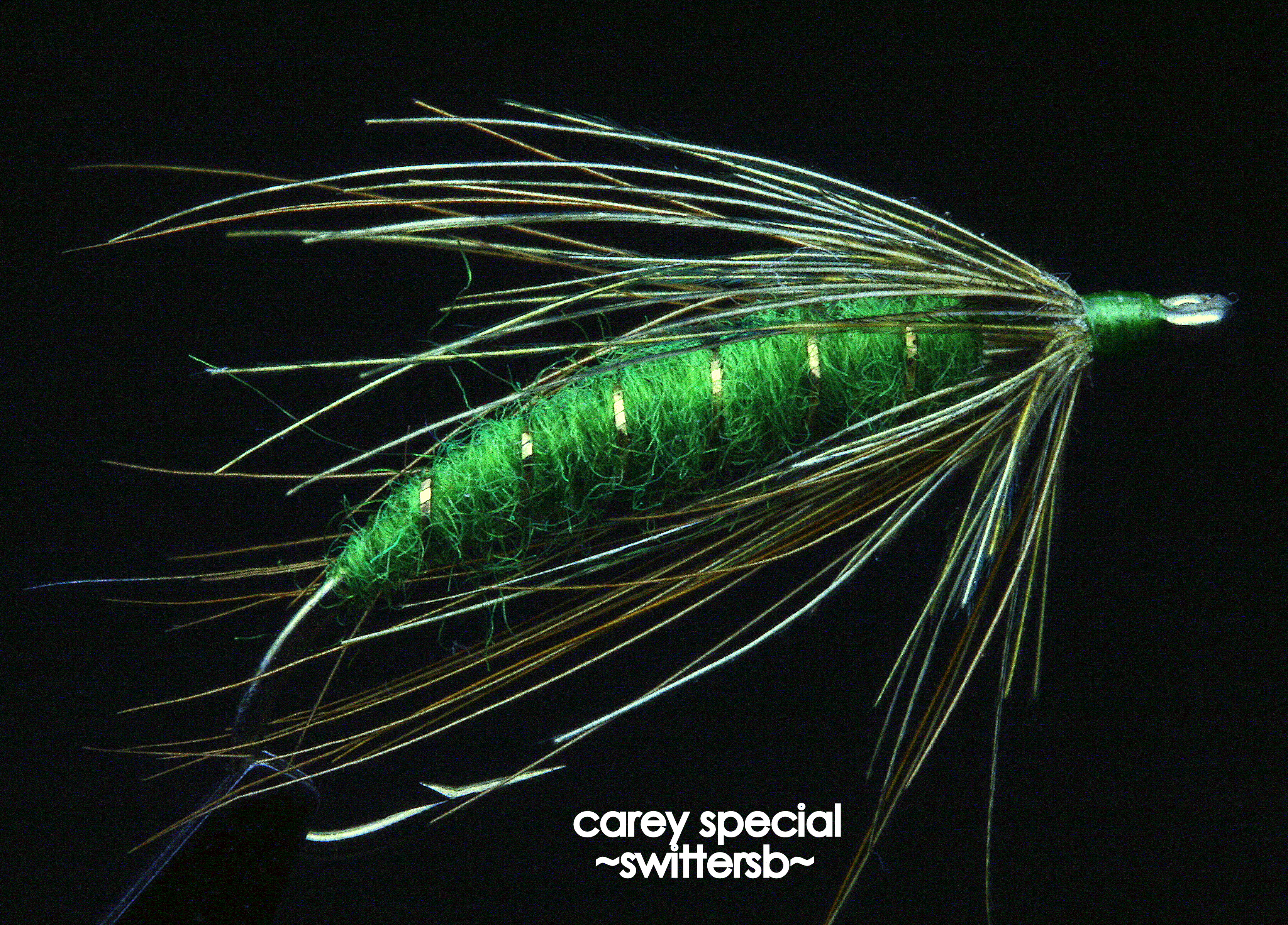 “Originally called the “Monkey-faced Louise”, until receiving the name Carey Special. It was aptly named the Carey Special from its originator, Colonel Carey. Doctor Lloyd Day of Kelowna found a groundhog on his fishing trip and asked Colonel Carey to tie a fly from the hairs. Today, it has many colors, and is usually tied with pheasant rump rather than groundhog.
