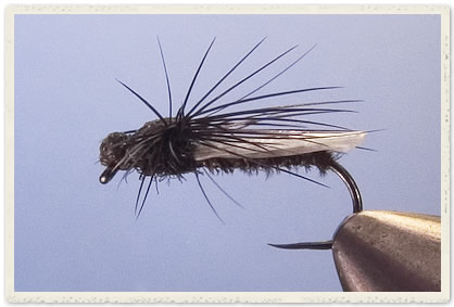 This is a nice, all purpose pattern that could stand in for chrionomids-gnats-buzzers, as well as the larger Hawthorn fly. The simple body of wrapped pheasant feather fiber (or turkey, or very light dubbing) will have it floating low in the surface film. There is a foam wingcase-head here. The UK pattern is in response to the April/May ‘hatch’ of the terrestrial insects. But, the many on line variations of the Hawthorn (Bibio Marci) (see Google Images) suggests it would be a great pattern year round on streams and stillwaters. Additional bug info.