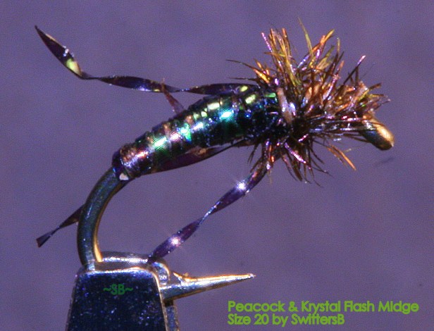 Here is a simple midge/chironomid pattern, on a size 20 hook, that I tied using two strands of Krystal Flash (peacock color) and a portion of one peacock herl. The thread was 14/0. Simply tie in at the bend of the hook and then tie in two strands of peacock Krsytal Flash. Wrap those two strands forward toward the thorax portion of the fly (final 1/3 to 1/4 of the shank). Tie off the strands and leave two short tag ends, which are forced to the rear by the thread wraps. I then create two additional small tags by tying in a small portion of flash on each side of the thorax. Then the one herl is tied in by the butt and wrapped two times to form the thorax. Finish off a thread head. Simple, flashy…a small dropper that I can get a tippet through the eye of the hook.This a nice beginner’s pattern that is a productive stillwater or stream pattern.