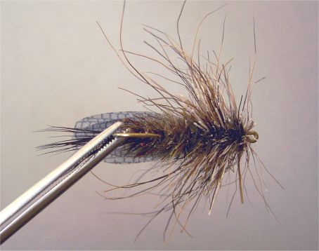 This tutorial show heavy dubbing, which is first trimmed for the abdomen, then a second stage of heavy dubbing that is trimmed top and bottom and maintained to show longer, protruding fibers on sides or ‘hotlegs’