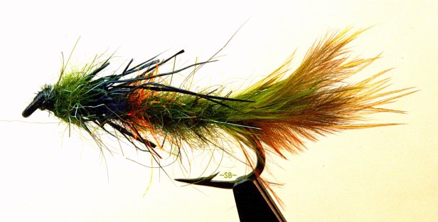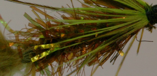 In the above pattern, I wanted a hint of hot green feather fibers on either side of the head. The hook is a size 12 streamer hook (Mustad 79580), the body is Roughfisher’s chenille.