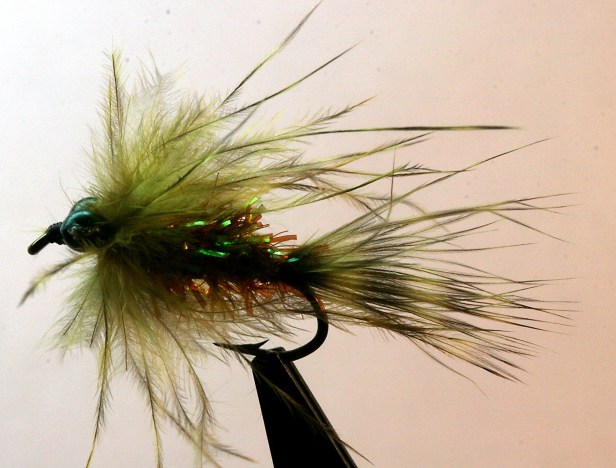 The flies components are in part from a company that slightly circumvents the do-it-yourself part of fly tying from Fly Tying Specialties http://www.flytyingspecialties.com/ The legs are Oliver Edwards Caddis Legs, an amazing look. I have several times used deer hair in a dubbing loop and come pretty close to replicating the look. Last time I tried it, it came out pretty darn good. But, FTS’s product is also quite good. The abdomen/thorax could be any synthetic dubbed and trimmed in green then orange. Again, I used a FTS product, a dubbing brush, that comes in many, many colors. In this instance it was an olive brush that is orange on either end. These brushes are used to create Czech Nymphs. Much of FTS’s product line was originally offered for Czech Nymph’s. The spot in front of the Caddis Legs was a turn of Ice Dub, a synthetic tri-lobal blend that is nice to work with. The tail was a pinch of orange and a pinch of olive aftershaft/filoplume/chickaboo…call it what you like…but the fluff at the base of a hackle stem that is often discarded but makes a nice tail for smaller numphs, woolly buggers, Timberline Emergers etc.