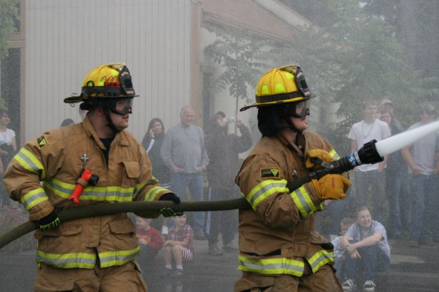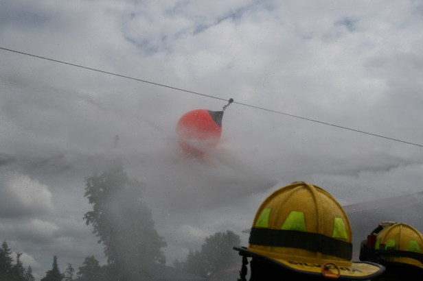 The large red ball is tethered to a long steel cable stretched tight between two props and two pick up trucks. The fire fighters use hoses on each end to compete on which team (agency) can propel the red ball past their opponent.