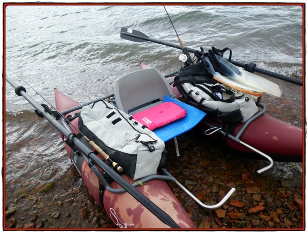 I cannot recall when I first acquired the Southfork pontoon ‘boat’…maybe 15 years ago or more. It has the old steel frame. I replaced the shorter oars with bigger oars for possible river use and more frequently rowing across big lakes. I also carry so much stuff that I replaced the side gear bags with bottomless, ill fitting bags that the oars brush over as I row. I have those pads because frankly if given the chance I will fish the whole damn day, or until my ass goes to sleep from the pressures across the back of my thighs from the seat edge. I love the damn thing, BUT….it can be like a giant sail boat in big winds. I have been blown so hard that I have come to a complete stalemate with the wind, rowing and neither gaining nor losing ‘ground’. Well hell that can’t last long. I have had to finally head to shore and cut my losses to stop from getting blown to the far side.