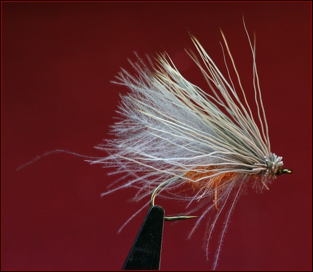 Size 8, straight eye hook, brown 8/0 thread, two herls of dyed orange peacock for abdomen with touch of orange dubbing for thorax, then one wrap of CDC and one wrap of barred orange hackle, under wing: three CDC feather, over wing: deer hair.