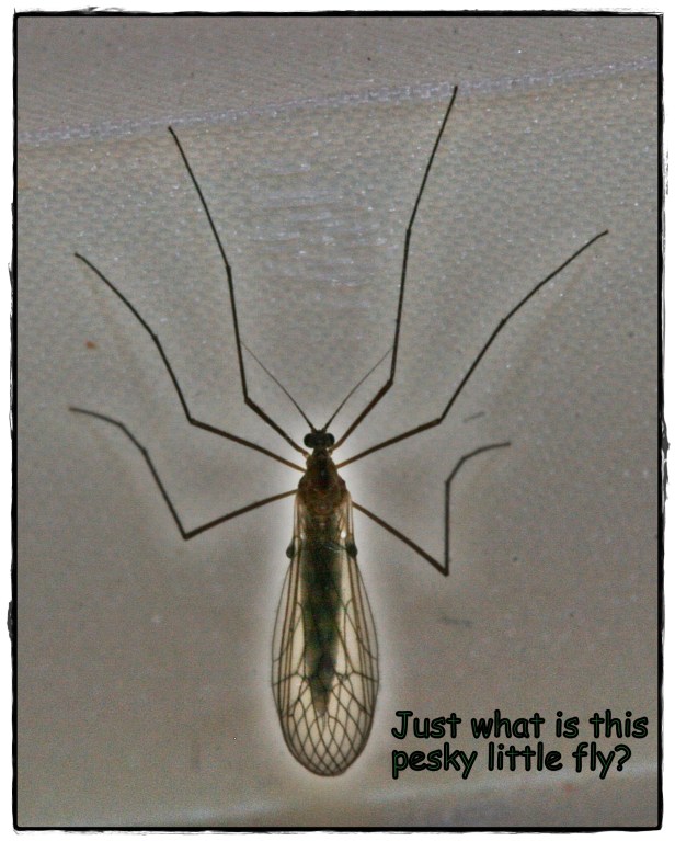 Last night, I ventured out to the rig for something and upon coming back toward the front door, I noticed the porch lights and white front door were covered with hundreds of these smallish flies. They looked like mid size midges, but they fluttered about quickly so I could not tell. As I walked inside, I considered how many I must have escorted inside. This morning, I noticed quite a few had made their way through the house to the kitchen sink and some water in a bowl, setting in the sink. So, I saw one nearby and snapped a photo. Don’t believe it is a midge. Any one know what variety of fly this is? Cranefly? Close as I could come with some research at Troutnut.