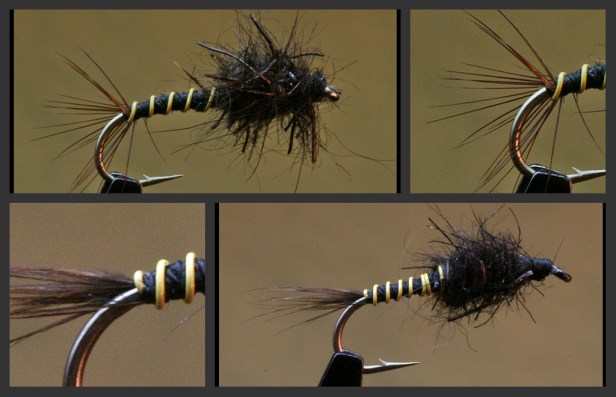 I set out to tie a size 14 Little Black Stone, or to experiment with a contrasting abdomen (lighter colored wire ribbing against a black 8/0 thread body) as well as a dubbed, spiky thorax over a weighted under layer non-lead wire. I tied a couple and what I found interesting (yet again) was that I did not see that I had butchered the tail in both instances as I commenced wrapping the fine wire ribbing.