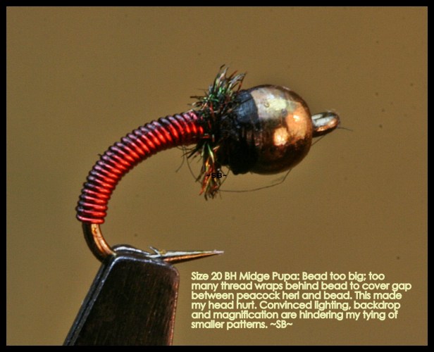 This is so true. We tie many patterns too large because it is easier and rationalized. We don’t recognize bug size and consequently reduce our odds of contact with fish during certain hatches/drifts. The size 14 is easier to see than the size 18. The hook up seems more likely with the bigger fly. Of late, I know that my larger ties are primarily an issue of eye sight and tying station backdrop. I will say that I tied 4 of these pupa’s before I got the wire wraps worthy of a photograph and only knew that after the photo was taken. Definitely need smaller beads. Midge patterns, small midge patterns, do not have to have obsessive attention to detail (wire body above). Simple thread bodies in different colors, ribbed with ultra fine wire, or contrasting thread or fine tinsels will do.