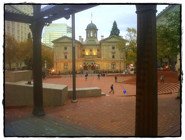 I was walking, in a hurry. I glimpsed to the right and saw the old Pioneer Courthouse. I pulled out the ol’ crackberry and snapped a shot. It turned out pretty darn good. I especially like the blue balloon drifting across the square. Tonight they lit the 75′ Christmas tree provided by Stimson Lumber. It occupies the center of the square, in the middle of the shot. Given more time a better shot would have been likely, but this was on the fly, a random shot. Darn light post!