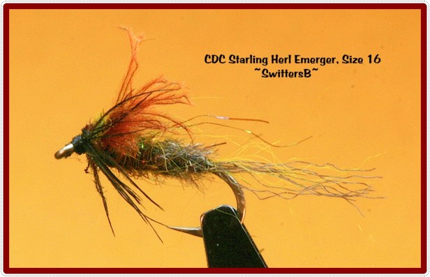 Another tweaked, variation of what I have been tying this weekend. In this instance, I used a single herl of dyed peacock for the abdomen. The thorax was dubbed and teased out a bit to trail back over the abdomen. The CDC wing and Starling hackle were tied in with less material on the size 16 hook. The thread was 14/0 Sheer. I really like the Nature’s Spirit bleached/dyed peacock sticks; very nice for gills in the abdomen area of a mayfly nymph. Or, for the thorax area where natural peacock herl is often used.