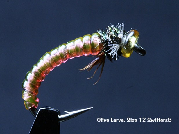 A simple beginner’s pattern that lends itself to the larva/pupa stages of Chironomids or Caddis. There are several kinds of vinyl ribbings out there. In this instance, I used a medium thick, vinyl ribbing, olive colored. To me, the most interesting part of this pattern is the beard (‘whiskers’). I saw this method about ten years ago from a Kamloops’ tier, Ed Smith. He pulled 3-4 short barbs from a hackle. The ends (the butts) you see here are actually the portion removed from the hackle’s shaft. They are tied in under the shank and if any of the usual whitish material is evident on the butts, I touch them up with a black permanent marker. They look just like knarly little legs emerging from an insect don’t they? The thorax is finished off with three turns of natural Peacock herl and an olive plastic bead was used. You can imagine the combination of abdomen and bead colors. A simple, yet effective fly on stillwaters and streams.