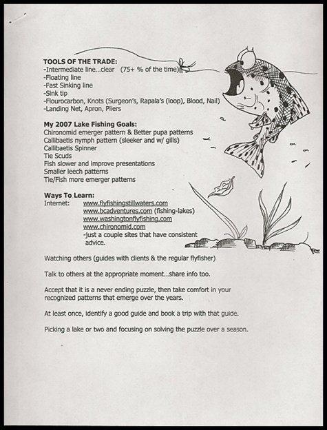 Several years ago, I did one of those Saturday morning classes at NWFFO’s in Portland, Oregon. Because I love fishing lakes, they asked me to do a class re Stillwater fly fishing. I put together an outline for the attendants and for myself to collect my thought and given them some idea where I was rambling towards. I attached here. My son, Tony, did the art work to liven it up a bit. The images are terribly presented, but I got them on here and blurry or not, you get the idea.