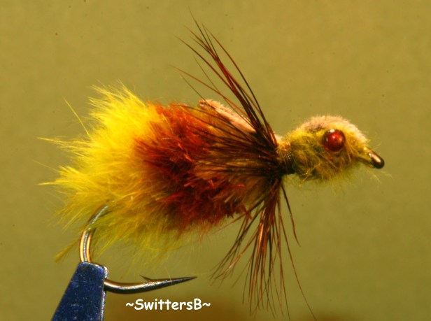 The above pattern was tied on a size 10, 2xl nymph hook. I dubbed and spun marabou fibers stripped from the stem. Once the density is developed for each color then the marabou is trimmed to shape the bulbous rear, tapering toward the front. At the front of the abdomen, I dubbed in some deer hair and then wound the hen hackle. The head is comprised of red dumbbell eyes (melted red Amnesia mono for eyes) the wingcase is a small piece of fuzzy foam tied in at the front the eyes. The head is dubbed to form a nice round head. Then the fuzzy foam wing case is pulled over the top of the head and tied off to form a slight gap between head/thorax and the abdomen.