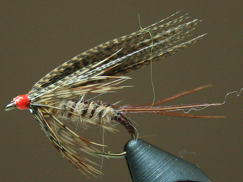 In an effort to search far and wide, I found this classic beauty on a Spanish dermatological site with no attribution re the fly nor even a reference to the picture itself. The fly looks to be tied on a size 12-14 hook, the tail is pheasant tail fibers. A dubbed body is ribbed with perhaps copper wire. It is not clear but the pheasant tail fibers may extend up the top of the abdomen and be bound down by the ribbing. I can’t quite tell. There is a partridge feather wrapped one to two times and overlaid with a wing of either mallard, gadwall or teal. The head is finished over with red thread and a coating of head cement.
