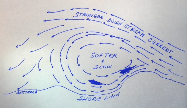 I was going to write the ‘back eddy’ but I think it is better to describe it as the shoreline eddy. The fly fishing literature will usually suggest the eddy is a ‘smorgasbord’ of food for trout (when did you last lay eyes on a smorgasbord?). Most eddy’s are the size of your car or smaller, with the occasional mega one. A shoreline projection into the current or bend in the river will create the eddy. Regardless of their size, food (insects) is funneled into these revolving, carousel like pools. The eddy, at some point, because it is rotating, doubles back up river against the normal downstream flow. The trapped food items are vulnerable to a trout, and your approach, if not stealthy, makes you vulnerable to a fish’s view. So, plenty of fish food and fish is exciting. But, the challenge will be the presentation. A dry, an emerger, a streamer drawn through hoping for that hit?