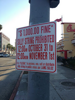 With all the things our poor government has to worry about: smashed pumpkins, candy wrappers everywhere, punks robbing little ones of their NERDS, toilet paper in trees, it is good to see the clarification re Silly String. Yes, for that one night a year, Silly String is in deed as illegal as heroin.
