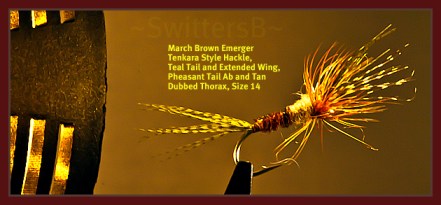Beefy ‘clinger’ nymphs in a darkish tone, size 12 can work proceeding what is often an afternoon hatch. Swinging Wet flies up through the water column can work and of course the Emergers and Dry fly patterns are worthy once surface action is noted.