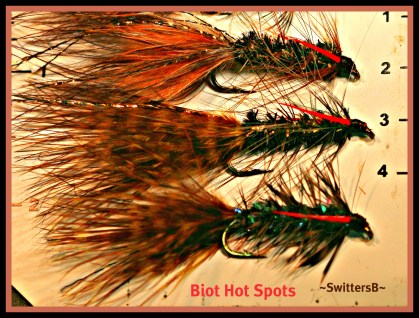 Regard the ubiquitous Woolly Bugger…I make no apologies in promoting or using the fly. It just works. But, the last few years with the Woolly Bugger (Little Fort Leech) and the Lake Bait pattern, I used dyed hot red and hot green hackle fibers or dyed hot red marabou fibers either at the top of the tail, but shorter than the tail length or at the sides tied in at the head. I have been wanting to experiment with the side of the head spot for an attractor hot spot. In the Brown Buggers, below, I used a dyed red goose biot. I will explore the length, durability and success of the material. Remember, the hot spot here is for an unweighted fly, so the hot bead head is not an option. Of course, the two could be combined with a heavier weighted fly.