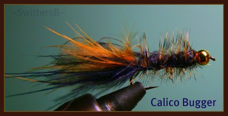 A typical Woolly Bugger pattern. The tying stages are the basic..crimp the barb and slide on the bead...tie in the tail material (in this instance, two colors of burnt orange over purple marabou)...then tie on the body material (black with purple rug yarn) at the rear, tie in at the area over the flattened barb and tie in the grizzly hackle by the tip at the same spot. Wrap the body material forward to the bead. Then palmer the hackle forward with even spaces (note my gap) and tie off and then bind it down behind the bead and done. The Calico Bugger was a great fly for me years ago in B.C. and then I got away from tying it. I am going to tie up a half dozen and see if they produce this year on the lakes and even in the rivers. The body material could be dubbing or one of the newer chenilles as well.