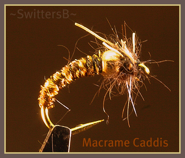Nothing exceptional here. Basic pupa patterns that utilize the materials I found yesterday in a hoarding house. Tucked away in boxes since 1982, the materials worked out just fine. An old macrame plant hanger from the 60’s & 70’s and a very old fish net were cut up for sections that formed the abdomens of the flies.