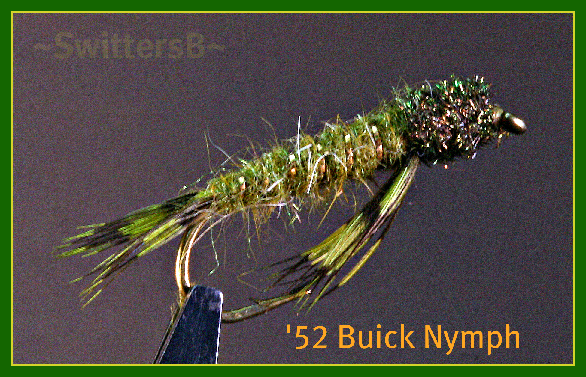 ’52 Buick: What a nice little, basic fly for a beginner: a Size 10, 2xl nymph hook (here an old Mustad 3906B hook). The tail is dyed green Guinea feather fibers pulled from the stem and a clump tied in at the bend. The ribbing here is older gold tinsel, but today I would opt for copper wire. The abdomen is a dubbed green rabbit fur, but again any green dubbing would do. The abdomen was dubbed up 3/4 of the way and then followed with the ribbing. Then a beard of guinea. The beard is not seen as much these days. The wing case is peacock sword and the thorax is peacock herl. The thread was 6/0 olive. Even if you forgo the beard this is a simple pattern to tie, meant for stillwaters. Easy to tie and a classic pattern.