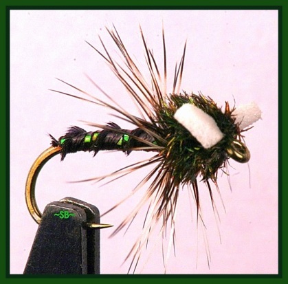 I started tying these back in December, but fell away from tying many due to life's distractions. I have now finished a couple dozen of these and that should suffice for a few years. The only derivation for this pattern is the ribbing of Krystal Flash over the peacock herl. You could use a variety of colors for some flash. I use the KFlash because of weight considerations. Even thin wire has tended to pull the fly under, over riding the foam wing's ability to support the fly in the film.