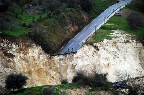 CRACKED IN HALF ROAD: A view of a road destroyed by a landslide Tuesday in the southern Italian town of Maierato. A landslide, thought to have been caused by heavy rains in the region, split a hillside in Maierato the previous day. About 200 residents of the town in the Vibo Valentia province have had to be evacuated, authorities said. (Belcastro Antonietta/EPA) | WSJ