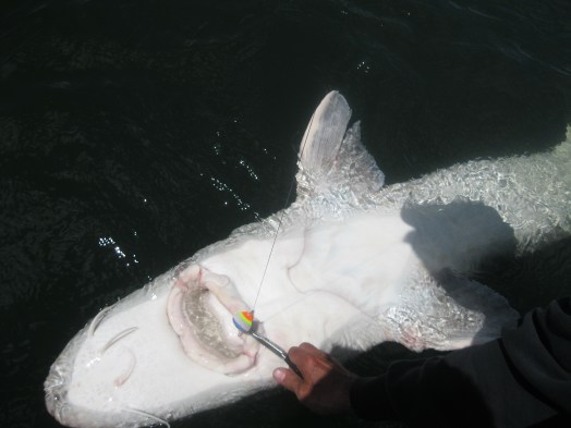 Yes, this surgeon was in the vicinity of 10′ long and somehow decided to gobble a rainbow spoon affair…not the normal glob of stinky bait on the bottom with seven ounces of lead holding it steady. The fish was well outside the slot limit and was released unharmed. Yet another story for Richard to add to his fishing journal.