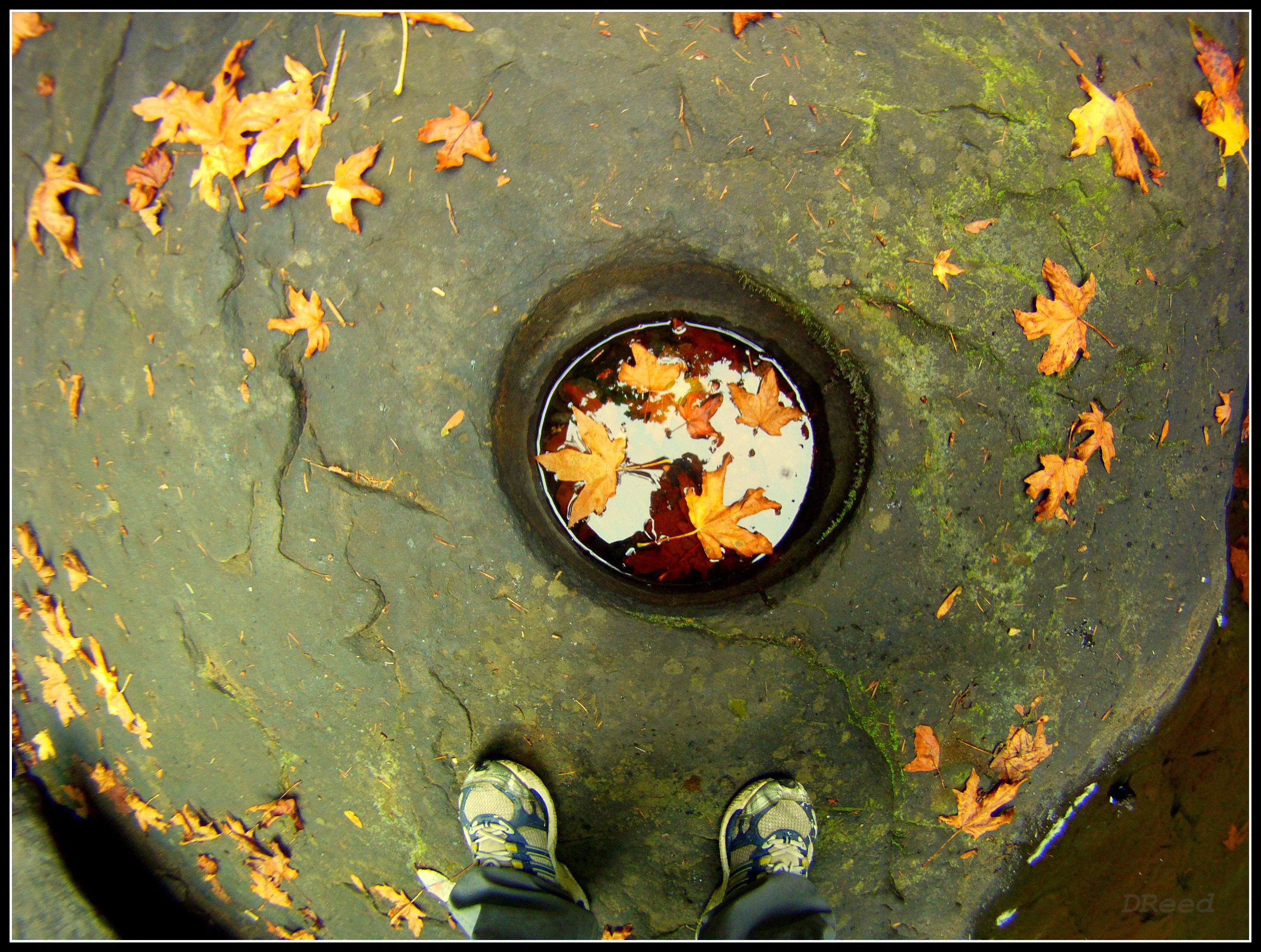 When there is a small crack in the rock, another small rock finds the crack in the rushing of the water of the stream. It then rattles around in the crack for a while causing the crack to round out a little before the rock wears down, gets swept away and replaced with a new larger rock. With the rushing water, the larger rock spins around and rounds out the crack a little more and gets smaller in the process until it, too, is replaced. The crack transforms into a hole, becoming larger and larger with ever passing rock that finds it. The rush of water gives the needed motion, and the persistence over years creates a smooth rounded hole.
