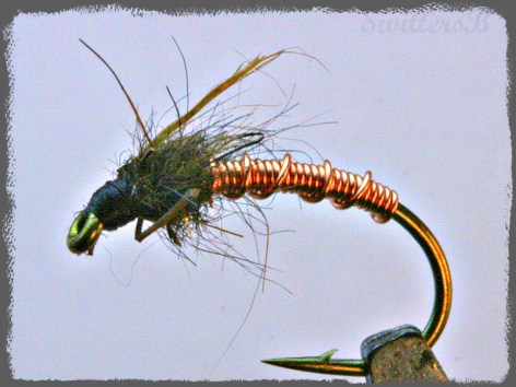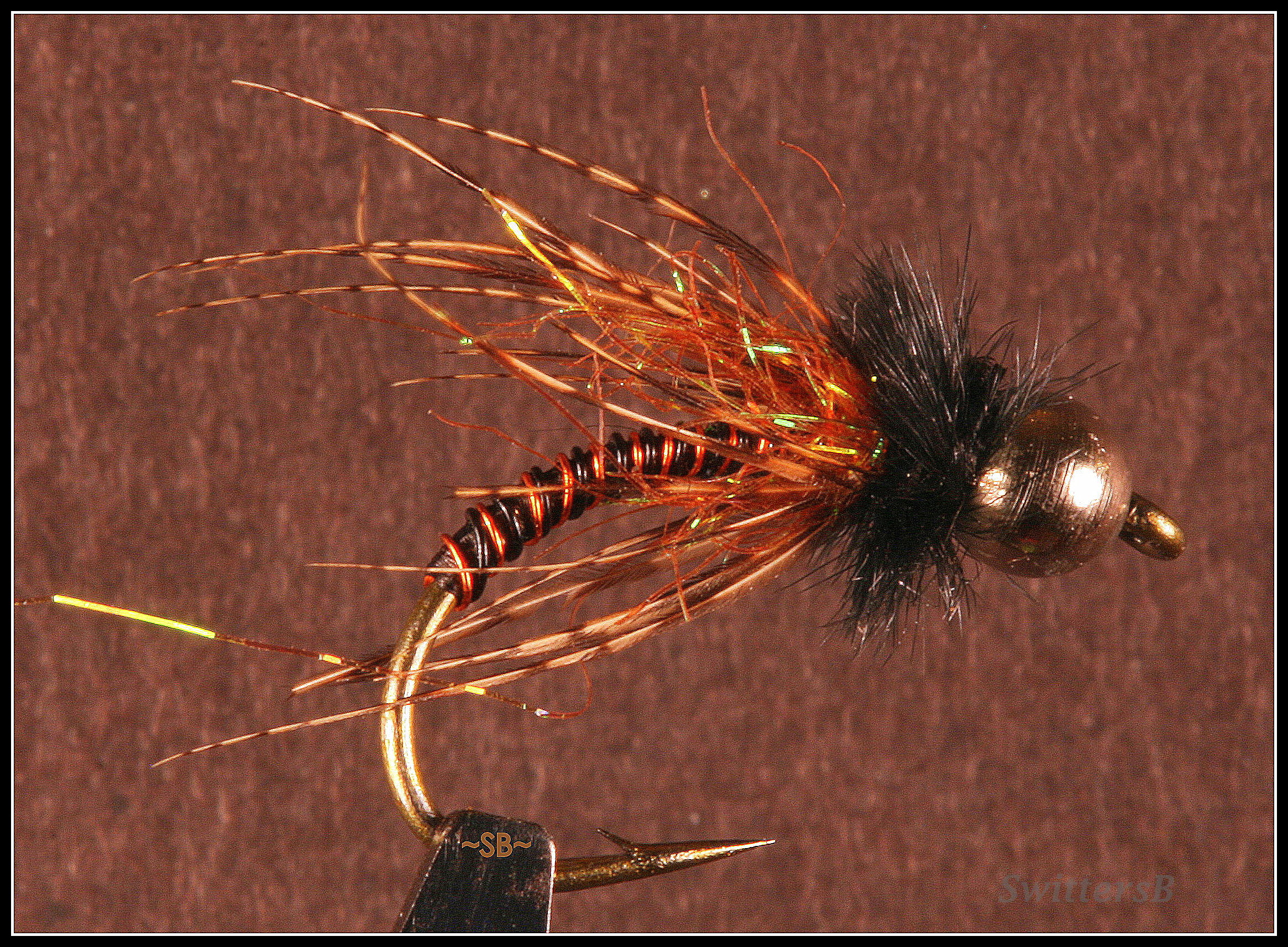 A Bead Head Pupa pattern. I used two different colored pieces of copper wiring wrapped over the simple thread body. Contrast, segmentation and weight. The busy hackle and thorax materials (Ice Dub, ostrich and partridge) add to the suggestion of life.An even simpler fly, equally dense to quickly sink. Copper wire tied in at the front of the shank and closely wrapped toward the end then used to rib forward over the wire abdomen. The dubbing ball for the thorax hides the tie in point for the copper wire.