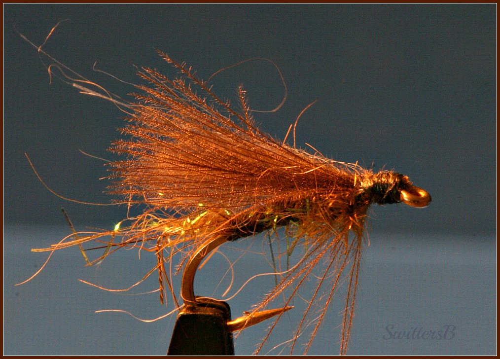 Rusty CDC for the wings and legs give such suggestibility of life. The hackle added to the lower patterns gives a higher floatation in the surface film. Do not add floatant paste etc. to the CDC.