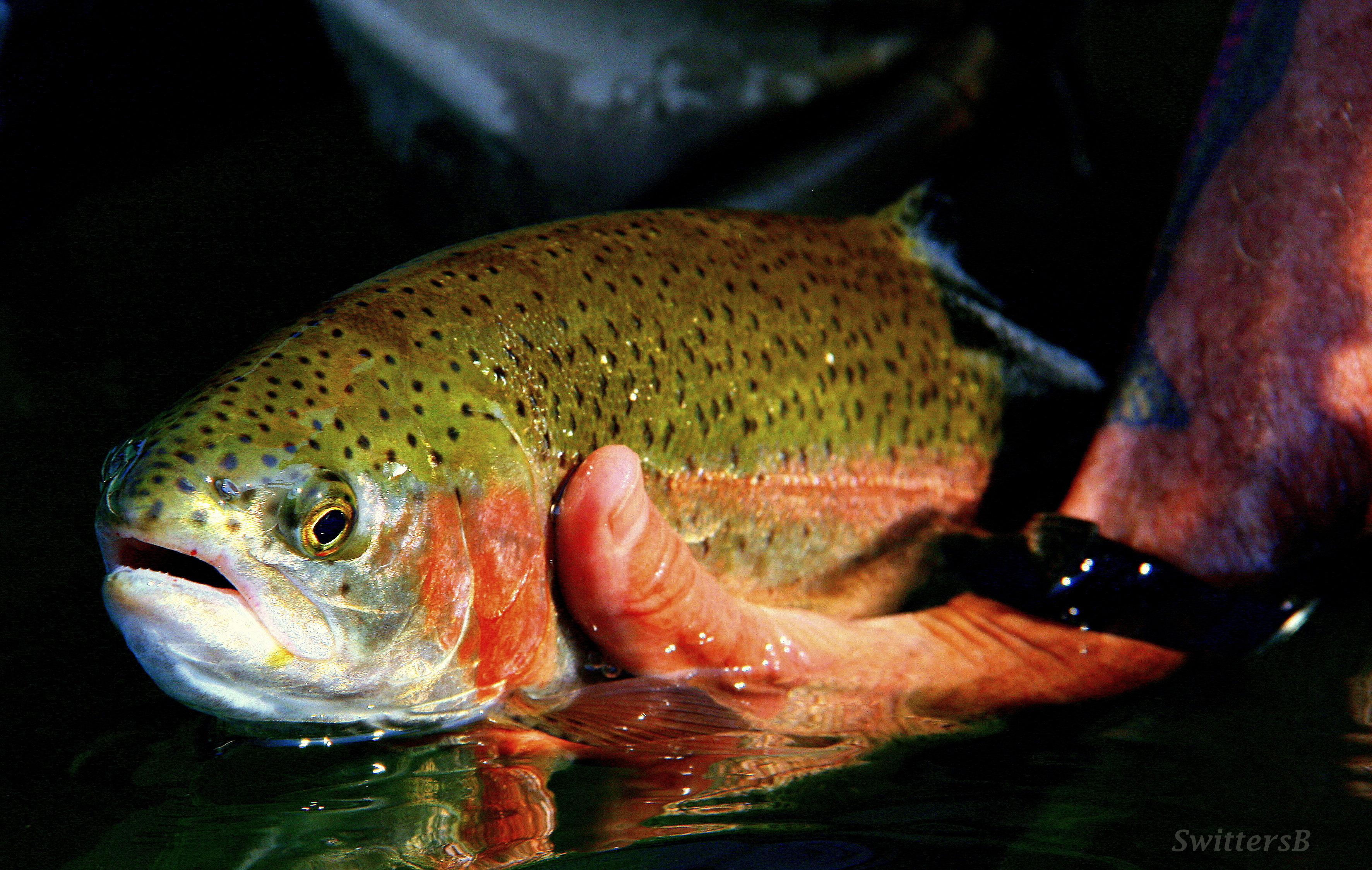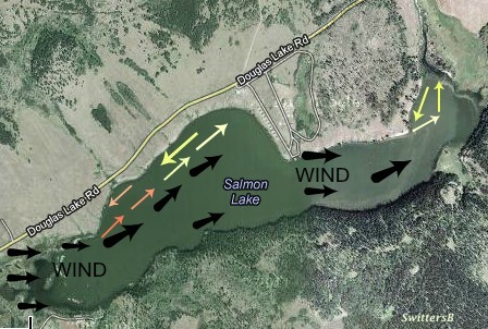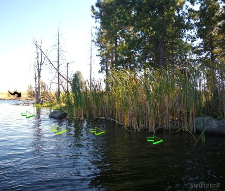 This is a an overview of Salmon L. in B.C. The Wind (black arrows) frequently came from the W/NW in June. I often found myself in a narrow area, out of the wind, shown by the yellow arrows. I would kick along the shoreline (catching fish) and when I reached an upper point I would turn and drift along the seam of wind/less wind. I was wind drifting and would control how fast I wanted to drift by how much I subjected my vessel to the wind. Often, the orange arrowed area (15 yards wide by 100 yards long) was the only respite and I must say it never failed to produce even if I was confined to a smaller merry-go-round. This area produced many beautiful Kamloops trout. The other end of the lake produced a similar area of safety, but I have fished it less.Here, on a recent trip, the wind tore along on the far left (black arrow) like a river. A finger of land jutted out to provide a wind break. You can see the cat tails waving in the wind. This quiet area provided shelter and excellent fishing in the quieter spots against the bank (green arrows). I caught a half dozen fish through here. I would rest the water a bit after thrashing it up with a fish and again have success.This was a beautiful Trout that took a Damsel dry pattern against the reeds in that sheltered back water ‘nook’…out of the wind.
