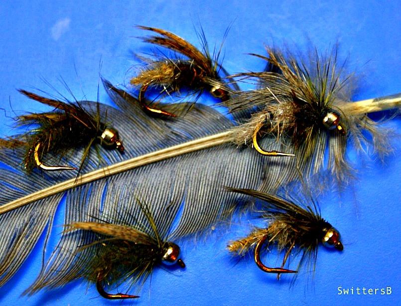 These are your standard bead head pupa patterns on the curved shank hooks (size 14). The pattern is unique in that I trailed a small portion of a dubbing brush from the bend of the hook and then wrapped the dubbing brush forward to build up the abdomen. Then a wing made from a section of hen feather and a turn or two of hackle behind the gold bead. The pattern is so productive. The trailing material from the dubbing brush stays intact and is durable.