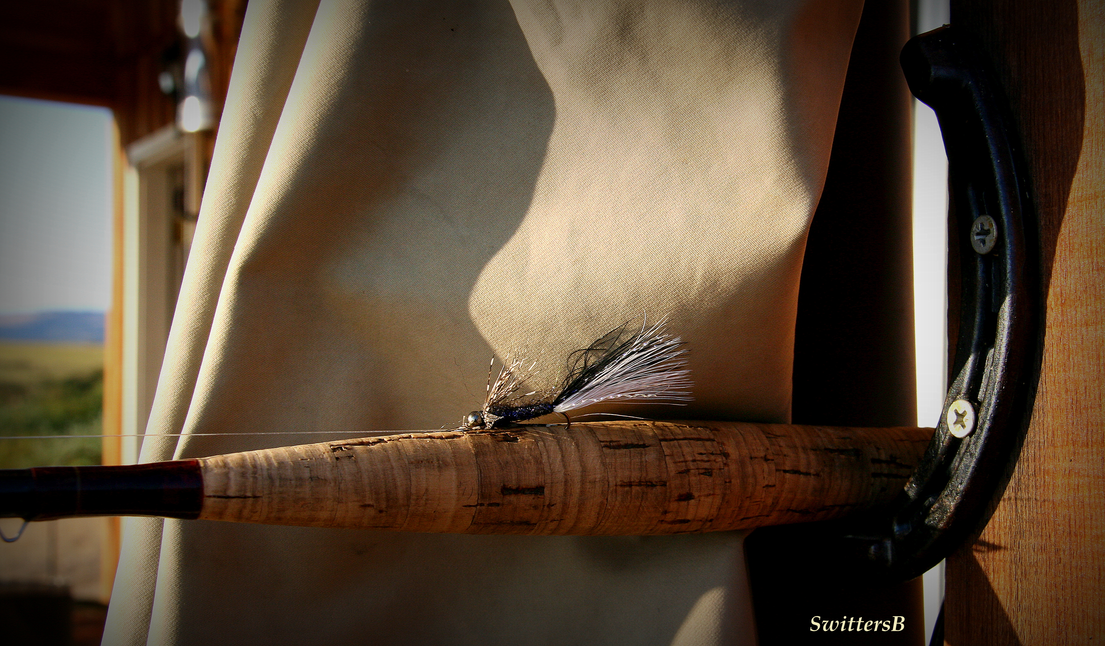 Here you see the rod’s cork handle…and to the far left a small metal loop under the rod…a hook keeper. Yet the fly’s hook has been set into the cork of the handle.