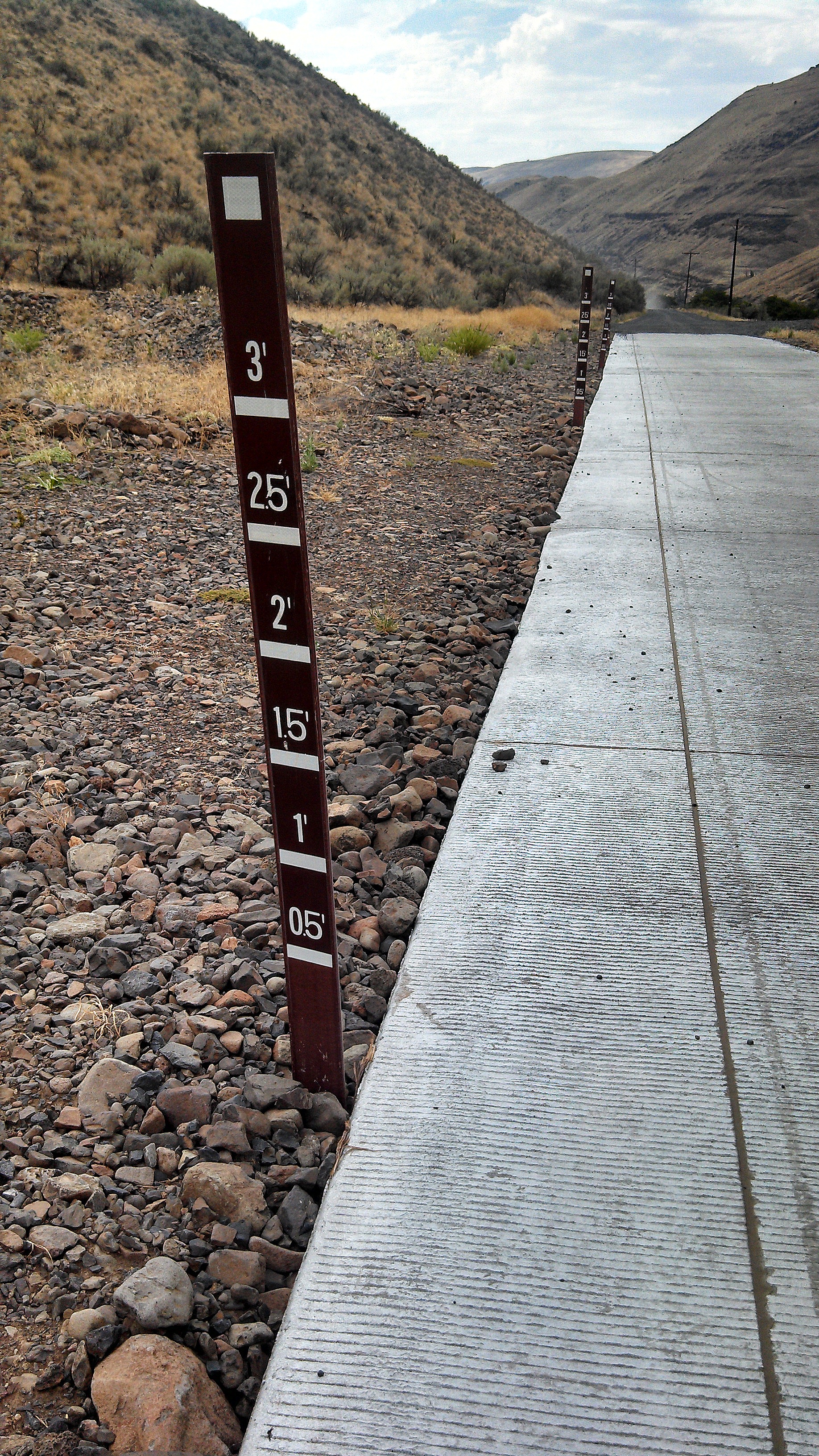Watching the news, we are aware of flooding, sometimes with catastrophic consequences. Oregon usually has the rivers over some banks in November or December and then in the Spring. On my recent excursion up the Deschutes River Rd. (BLM Access Road), I noticed a, new to me, paved portion of the bumpy gravel road. The look was unique to Oregon roads and apparently with good cause. I have seen these markers and warnings in Arizona and Texas, but never Oregon. Yes, as the stereotypical image suggests, it rains a lot in parts of Oregon. In other parts less so, but apparently when it does….look out.