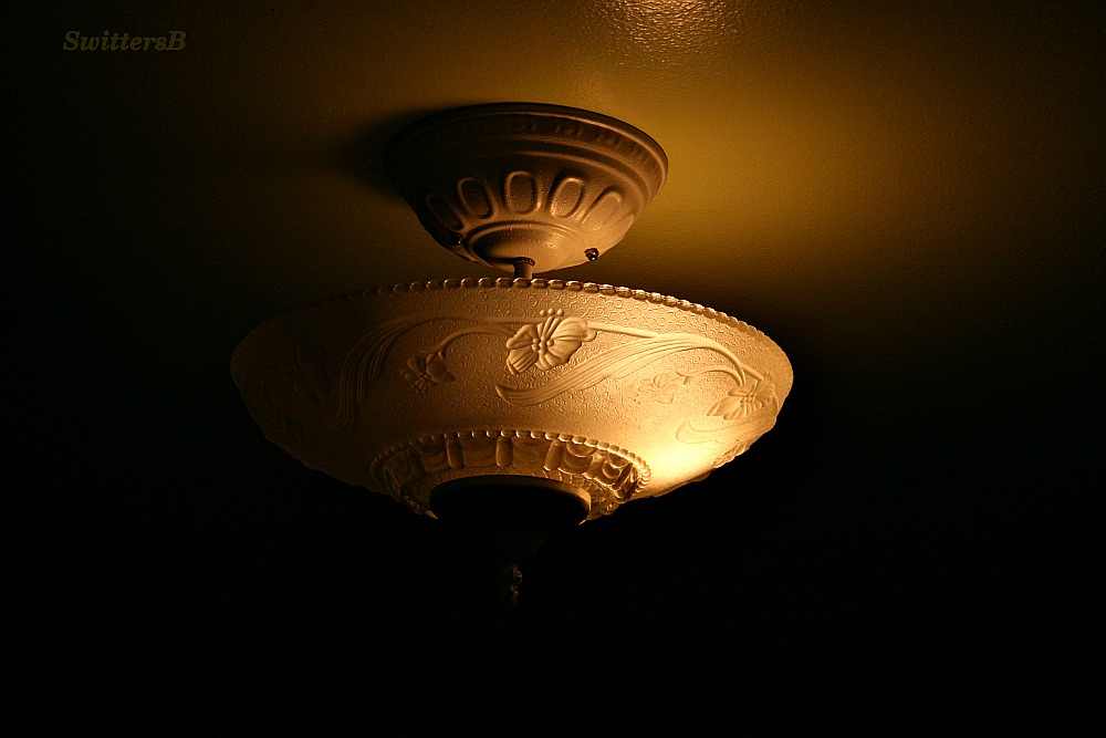Often at the conclusion of such efforts there is an estate sale for the remaining, salvageable valuables. I have come to learn that everything goes, including all the ceiling lights. We marked this one ‘NFS’ (not for sale) and indeed it was one of just two remaining lights. With but one bulb working, the lamp gave off just enough light to show the beauty of the old light fixture.