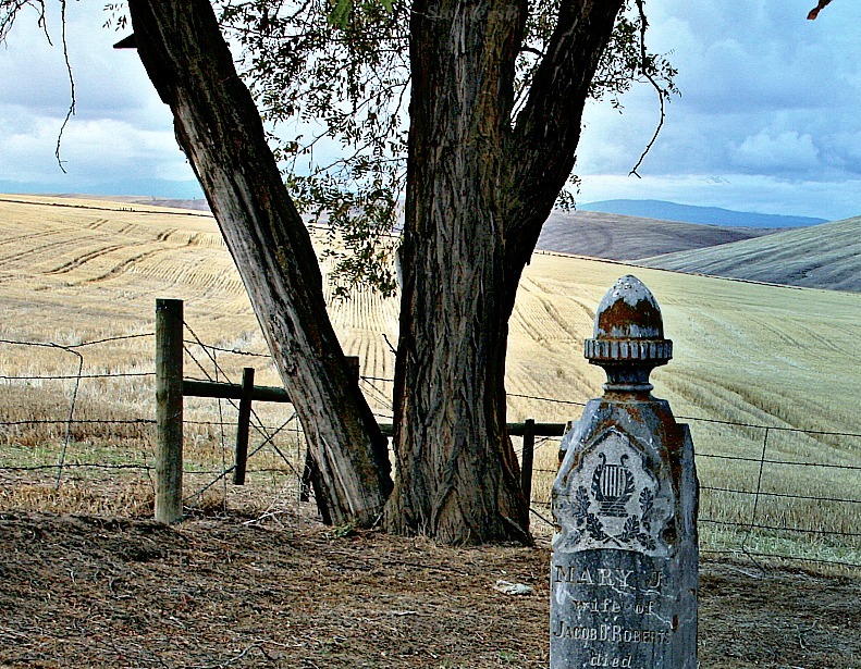 A single marker in a back corner of a pioneer cemetery in central Oregon. A beautiful vista to the West…the wheat fields cropped and the clouds building.