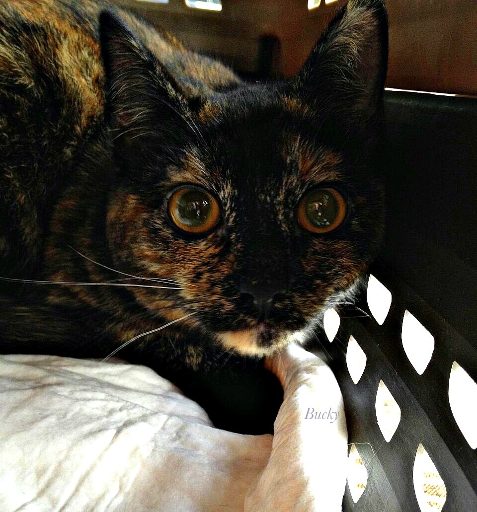 Ninnie is the kitten we rescued July 4th. Here, the little Calico, is in a carrier enroute for a routine check up and like most cats quite skittish about not being in control of the unknowns…like us I suppose.