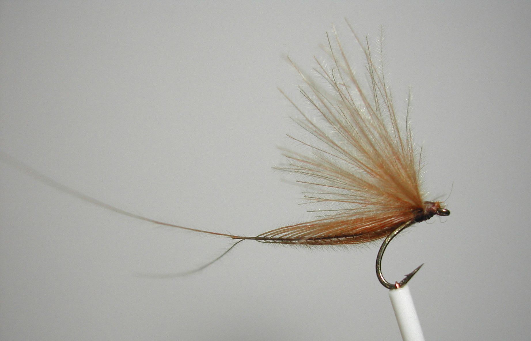 Delicate and may sustain some damage after a fish or two, but given the simplicity of the tie and the reputed effectiveness, who cares. Tie a row or two and dance along the surface. A delicate fly for selective and non-selective fish: trout/grayling
