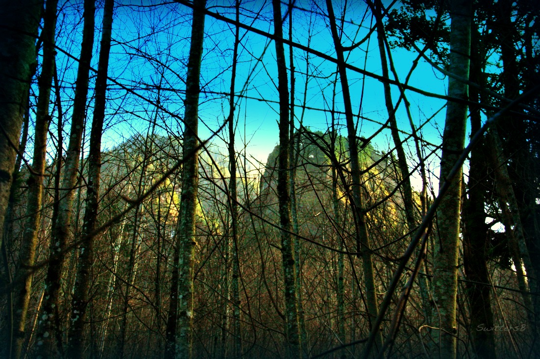 The word that comes to my mind is ‘looming’ – I get a sense of the majestic height of the trees and the mountains… Into the light creates a surreal, dreamy feel. Great shot!